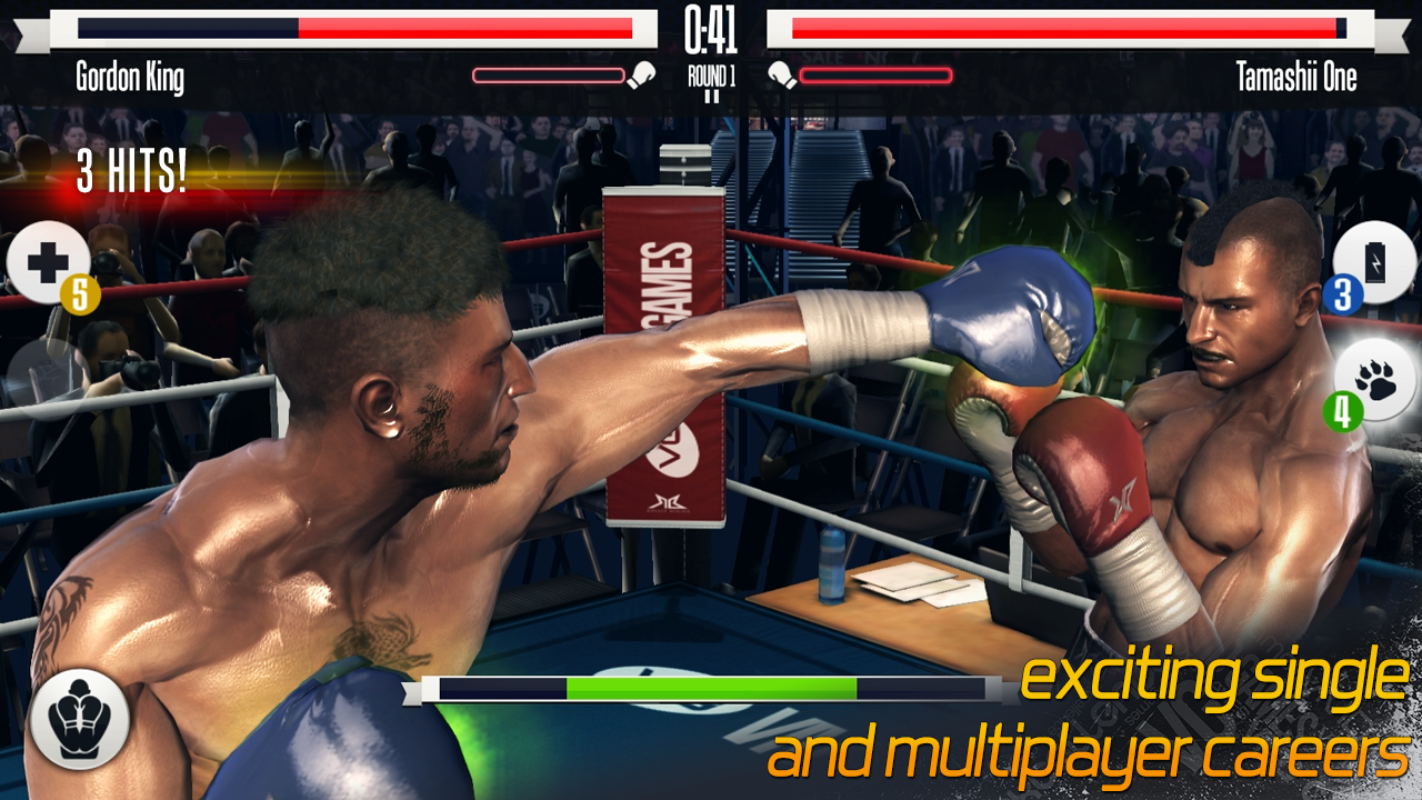 Featuring ultra-realistic motion capture from real boxers plus amazing graphics from the powerful Unreal Engine 3, you’ll see sweat and blood fill the air and you’ll feel every hook, jab, and uppercut in Real Boxing, the most exciting boxing game yet on the Android.